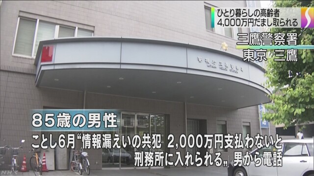 東京・三鷹市の独り暮らしの85歳の男性が「情報漏えいの共犯として刑務所に入れられる」といううその電話を信じて現金4000万円をだまし取られ、警視庁は詐欺事件として捜査しています。